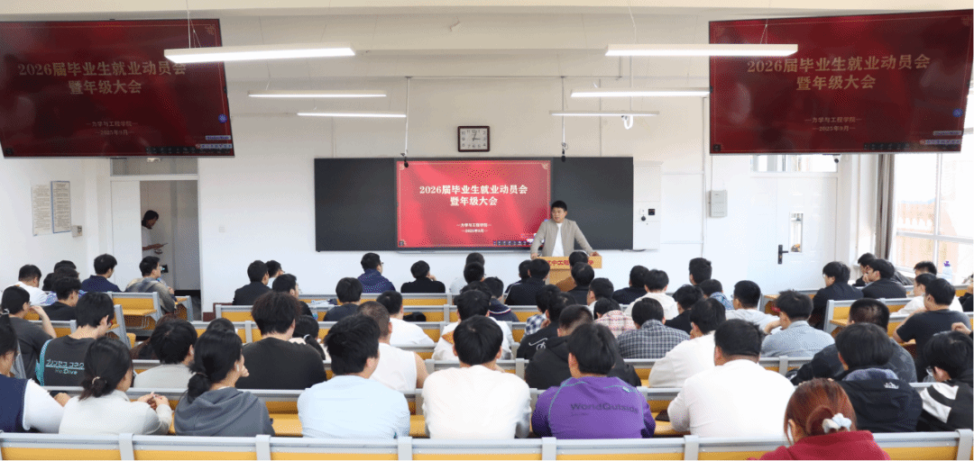 为使2026级毕业生顺利完成从校园到社会的过渡,充分了解就业形势,树立正确就业观念。力学与工程学院于2025年9月17日于新华楼202召开2026届毕业生就业动员暨年级大会。会议由学院学工部主任王瑞斌主持,全体2026届毕业生参会。