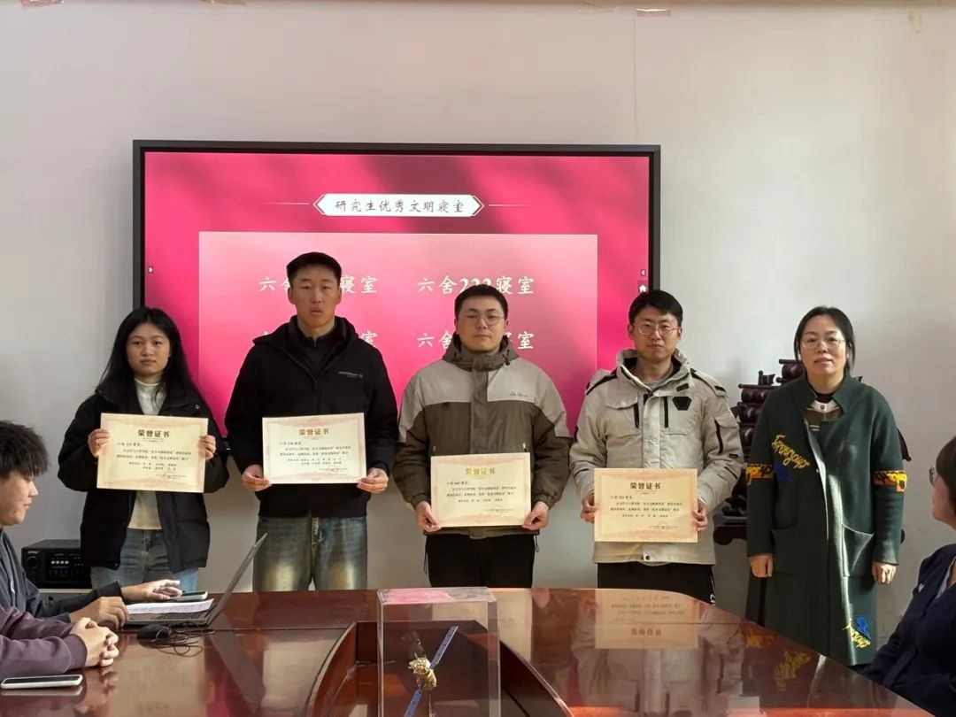 会议伊始,研究生辅导员黄轶铂宣读“研究生优秀文明寝室”获奖名单,六舍232寝室、六舍222寝室、七舍326寝室、六舍645寝室获此殊荣。随后“研究生优秀文明寝室”获奖代表李岑蕊发言,表示将以此次表彰为动力,发挥好模范带头作用,继续发扬团结友爱、互帮互助的精神,在学业上寻求更大突破,在生活上营造更加温馨安全的环境,为校园文化增添更多光彩。