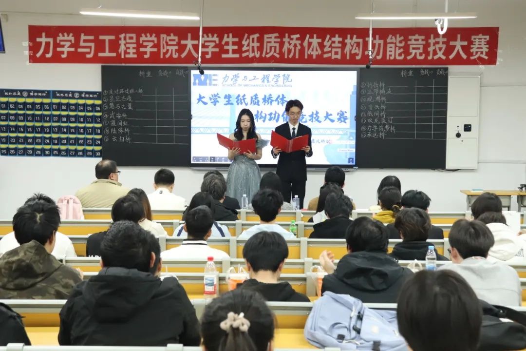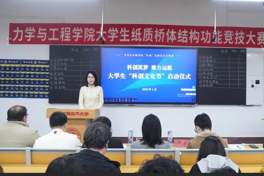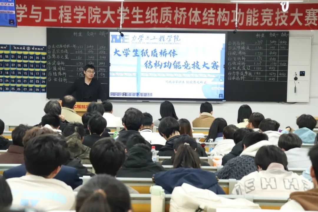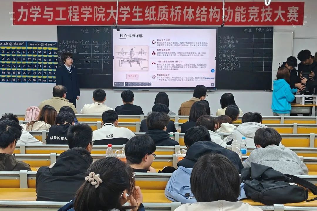 为进一步引导青年学子积极投身科技创新活动,营造深耕专业的学术氛围与团结协作的集体精神。4月1日晚,力学与工程学院在新华楼202教室举办2026年大学生“科创文化节”启动仪式暨大学生纸质桥体结构功能竞技大赛。学院党委副书记兼副院长王丽宏、副院长王俊光、工程力学系教师陈峰、理论与应用力学系教师刘晓伟、学院团委书记解书华、学工部主任王瑞斌出席活动,2025级学生参加活动。本次大赛共吸引35支队伍报名参赛,经过初赛选拔,15支队伍晋级决赛,同台竞技、尽显巧思。