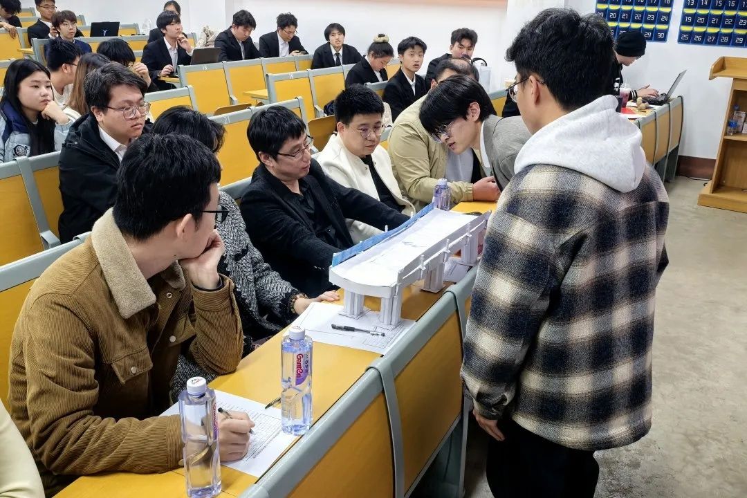 学院团委书记解书华首先介绍了本学期科创文化节的活动方案,方案涵盖朋辈交流、学术讲座、项目孵化、学科竞赛项目内容,共计10余项专题活动。随后,主持人宣读纸桥大赛比赛流程与评分标准,各参赛队伍随即完成签到、桥体称重及尺寸测量,进入比赛状态。各组通过实物展示与PPT讲解相结合的方式,将课程思政元素融入作品设计,生动诠释了纸桥模型背后的力学之美与创意之思。严谨合理的桁架结构,融入爱国精神的设计理念、独具匠心的桥体造型赢得评委与观众的赞许。副院长王俊光在活动点评中指出,本次赛事组织有序,同学们的作品亮点纷呈,活动不仅锻炼了同学们的团队协作意识,更让大家在动手实践中加深了对专业知识的理解,他鼓励同学们以赛促学,积极投身各类科研竞赛,在比拼中锤炼本领、拓展视野,持续夯实成长根基,努力实现全面发展。