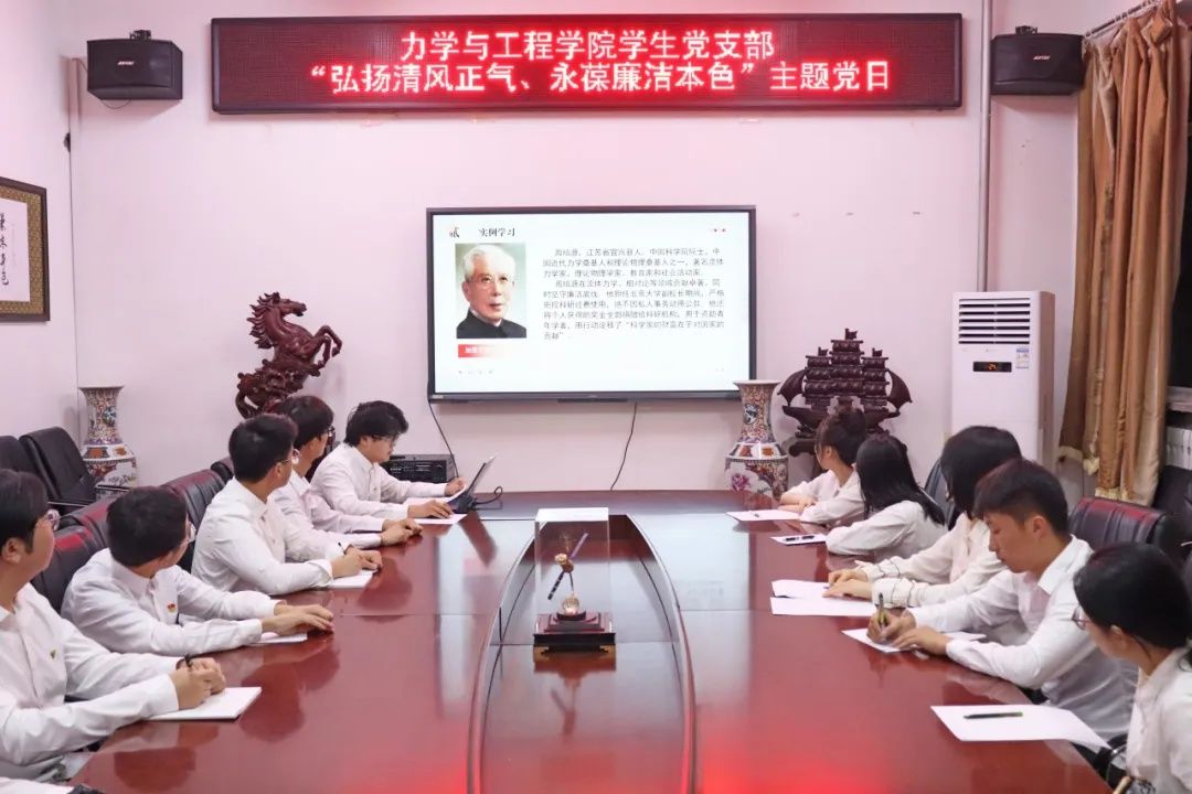 王丽宏首先对全体党员提出三点希望:一要常学常新,筑牢廉洁思想根基,补足精神之“钙”;二要知行合一,将廉洁自律化为日常行为准则,守住规矩底线;三要示范引领,带动广大青年崇廉尚洁,共同涵养清风正气。理论学习环节,与会人员共同学习了廉洁文化的内涵以及党的十八大以来深入贯彻中央八项规定精神的成效和经验。在实例学习环节中,钱学森、周培源等力学领域科学家、教育家的廉洁事迹让在场党员深受触动。此外,大家还观看廉洁警示教育片,共同思考如何在生活中践行廉洁自律作风。